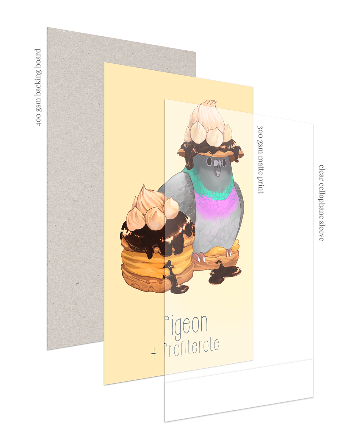 148mm x 210mm, 300 gsm semi-gloss print + 400gsm backing board + cellophane sleeve