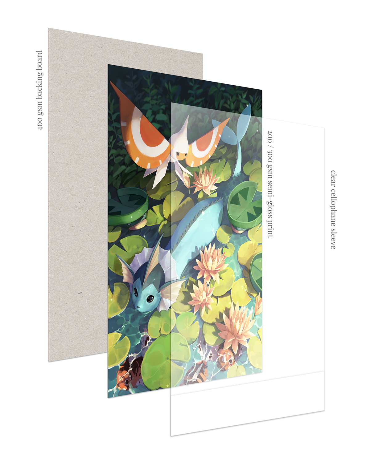 A5: 148mm x 210mm, 300 gsm semi-gloss print + 400gsm backing board + cellophane sleeve