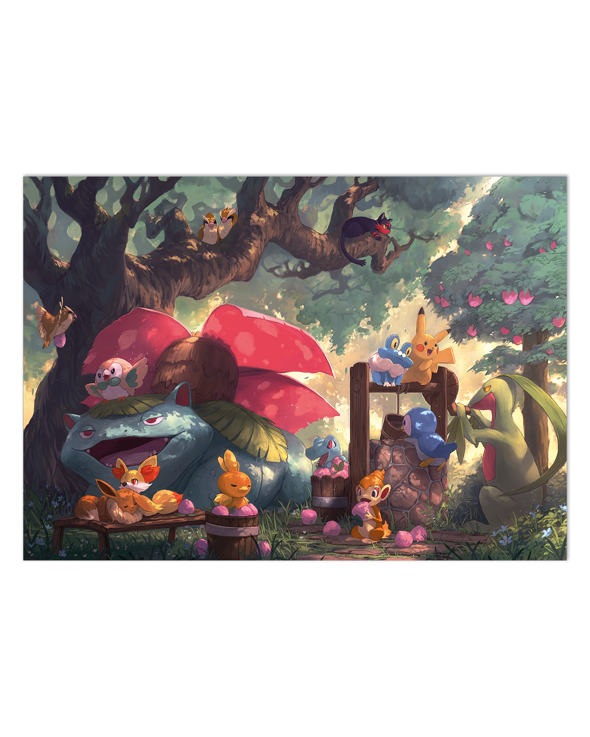 art print of petal dance. originally drawn for the petal dance pokemon zine, this artwork features several grass pokemon including sawsbuck, treecko, rowlet and shroomish!